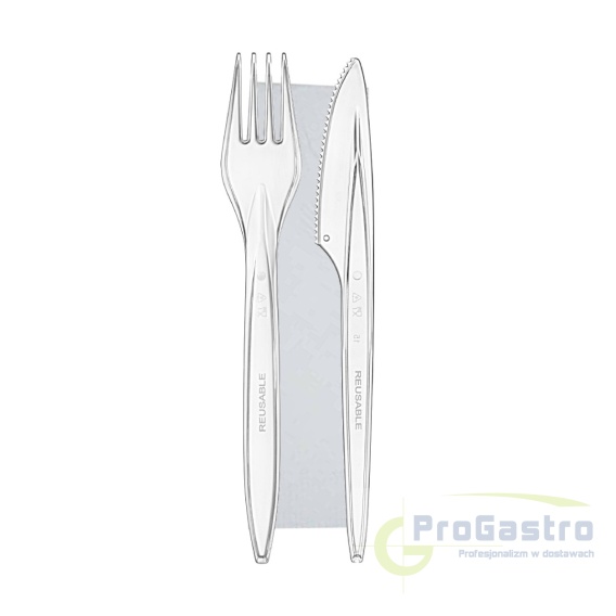 Komplet sztućców jednorazowych Transparent Superior – widelec, nóż i serwetka | Premium 50 sztuk